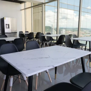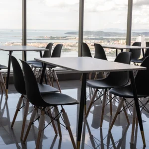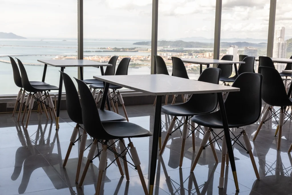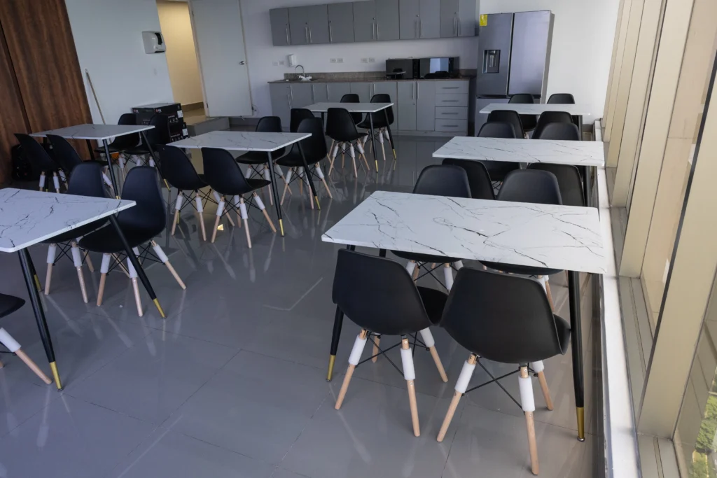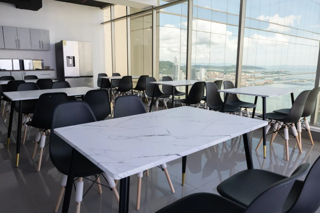 Esta solución incluye mobiliario para cafeterías tipo Co Working, con sillas y mesas.