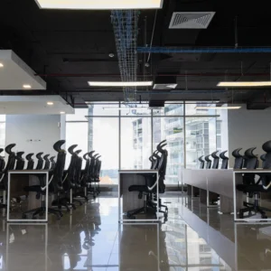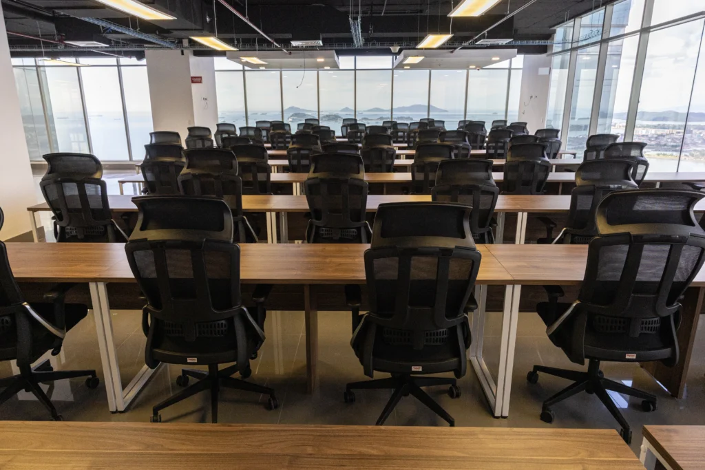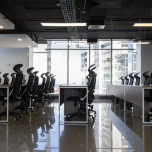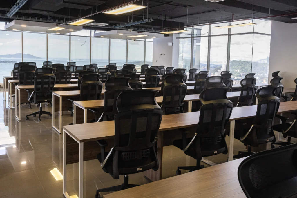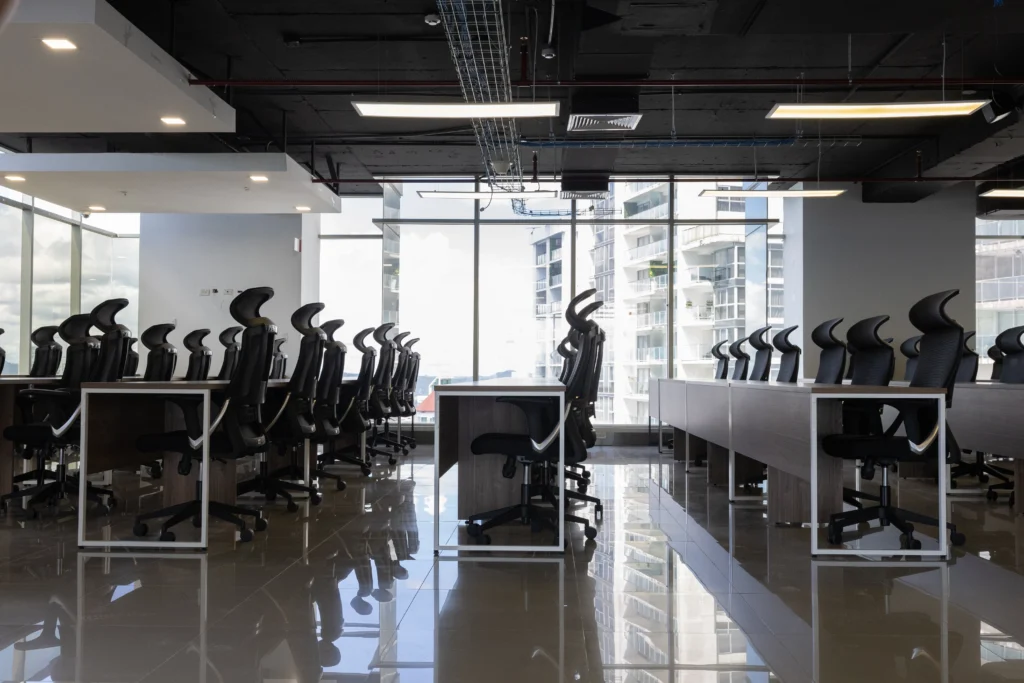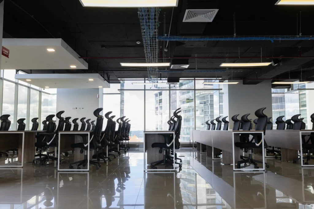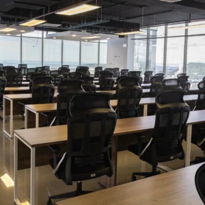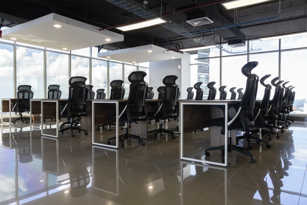 Esta solución incluye 63 puestos de trabajo en área abierta de trabajo tipo Call Center. Con más de 16 mesas tipo Estaciones de trabajo.una estación de trabajo tipo Co Working, con sillas de oficina y mueble tipo credenza (librero)
